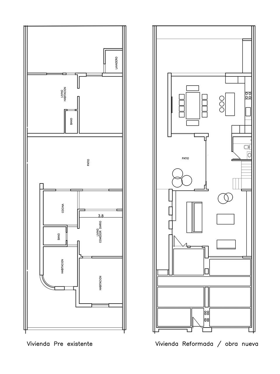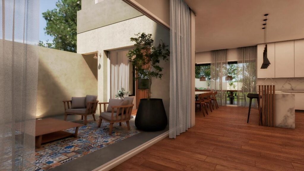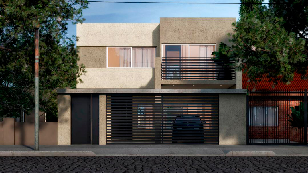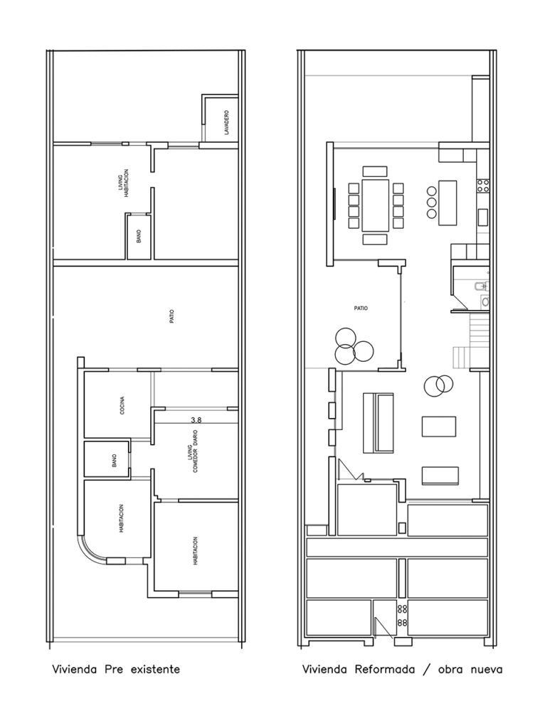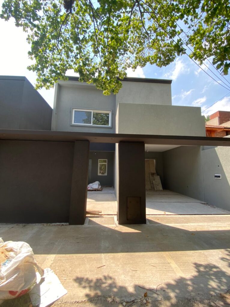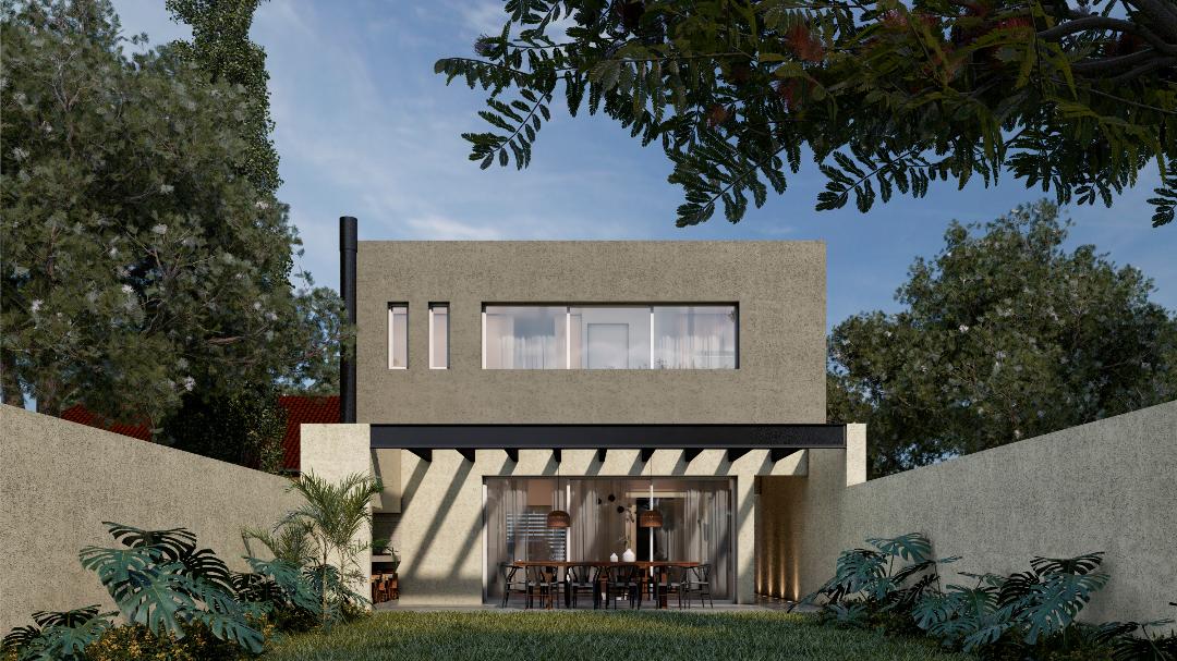 Vivienda con patio central. En la planta baja se lleva a cabo el sector publico, contando con living, comedor, cocina y sector quincho. La planta alta posee 1 lavadero, 2 dormitorios con un baño compartido y el dormitorio principal con baño en suite.